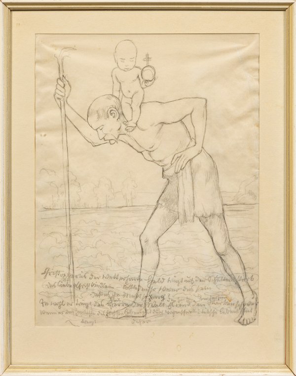 Studie zu der Radierung von 1915 und insbesondere der Farblithographie von 1916 mit korrespondierendem, eigenhändigem (von der Lithographie abweichenden) Gedicht "Christopherus(,) der wetterharte Held(,) trägt auf den Schultern stark(,) das liebe Christkindlein - sollte doch so schwer es sein, das es ihn drückt so arg? Jawohl(,) er trägt das Heil der Welt! Es wird dem Starken schwer(,) wenn er das zarteste(,) das höchste Lebensgut durch Wogenschwall und tücksche Lebensflut trägt daher". Bleistift/Papier. Zu den Rändern gewellt. 26,5 cm x 20 cm (Passepartoutausschnitt). Rahmen.