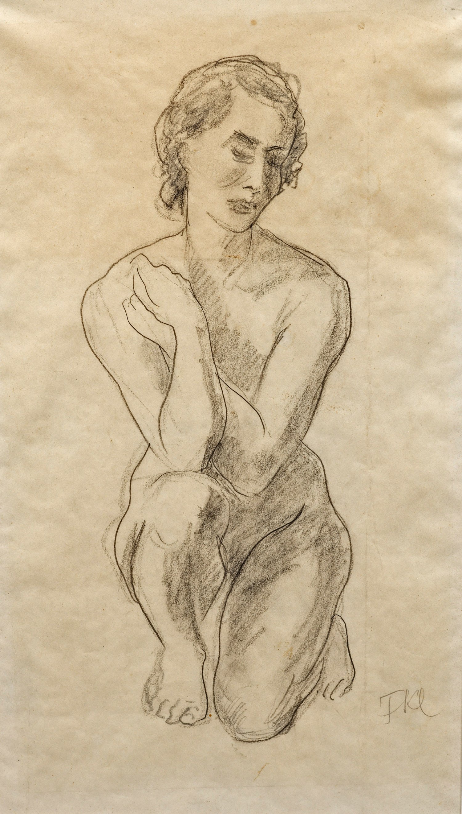Mit kräftiger Kontur und lockerer Schraffur gezeichnetes Studienblatt des bedeutenden Bildhauers, dessen Hauptaugenmerk dem weiblichen Akt galt. Bleistift/Papier. R. u. monogr.; Verso Etikett mit Werkangaben und Hinweisen zur Provenienz. 45,1 cm x 25,7 cm (Passepartoutausschnitt). Rahmen.