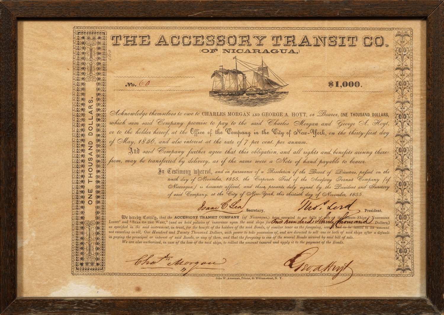 Rare bond of the "Accessory Transit Co." with signature of Charles Morgan from 1855.