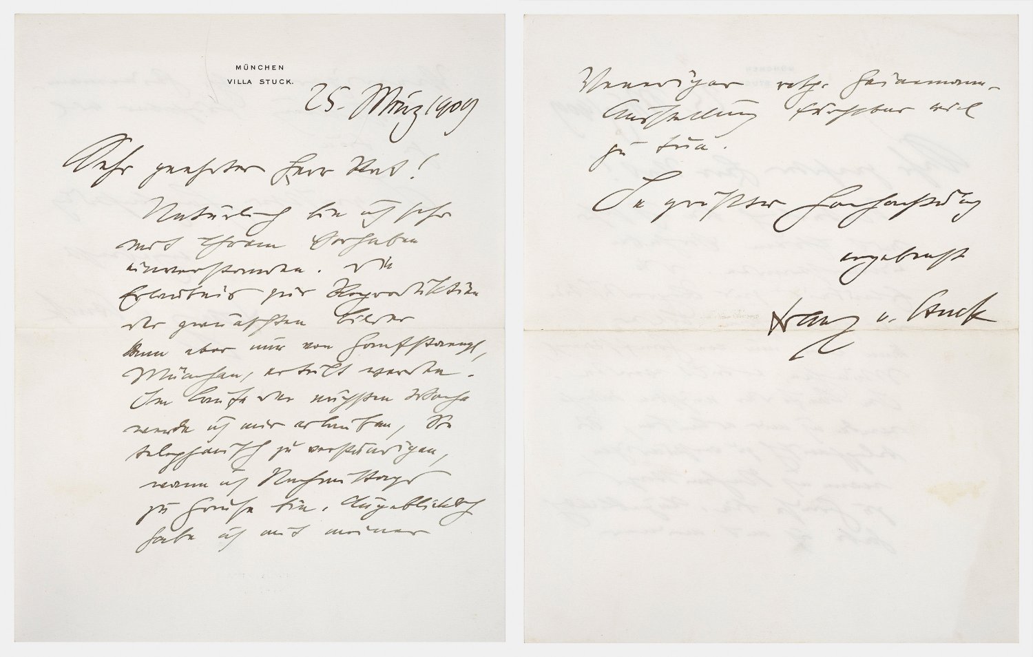 Zweiseitig, handschriftlich beschrieben und dat. "25. März 1909". Briefkopf der "München Villa Stuck". "...Natürlich bin ich mit Ihrem Vorhaben einverstanden. Die Erlaubnis zur Reparatur der gewünschten Bilder kann aber nur von Hanfstängl, München, erteilt werden... Habe ich mit meiner Heinemann-Ausstellung furchtbar viel zu tun...". Mittig gefaltet. 22 cm x 17,5 cm.