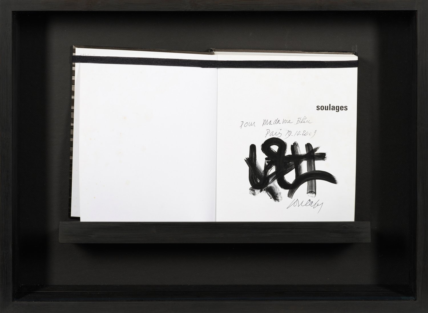 Exhibition catalogue "Soulages" with original artwork by Pierre Soulages. Gouache (or black brush), signed and dated 2009 with dedication. The catalogue published by Centre Pompidou Paris. Minor foxing. Display frame.