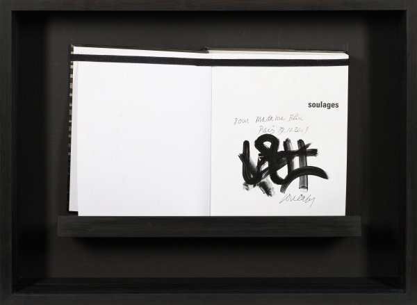 Abstrakte Komposition in Ausstellungs-Kat. "Soulages", Hrsg. Pierre Encrevé und Alfred Pacquement, Centre Pompidou, Paris 2009. Signierte Arbeit in schwarzer Gouache (bzw. Tusche) auf dem Vorsatz des Katalogs mit Widmung "Pour Madame Blin Paris, 19.10. 2009". Hardcover. Einbandinnenseite u. Vorsätze ger. stockfleckig. Vorsatzblatt mit Arbeit von Soulages 28 cm x 22,7 cm; Buch ca. 28,8 cm x 24,5 cm. Im Kastenrahmen.