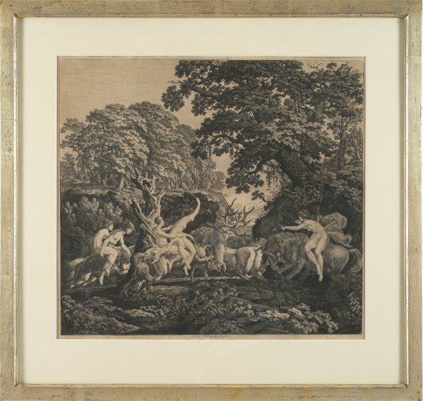 Radierung/Papier, um 1796/1797. In der Platte betitelt und bez.; In einer heroischen Eichenlandschaft jagen drei Amazonen und zwei Männer auf Pferden einen großen Rothirsch. Wvz. Martens 221. Darstellung: 38,4 cm x 42,2 cm. 39,4 cm x 42,9 cm (Passepartoutausschnitt). Rahmen.