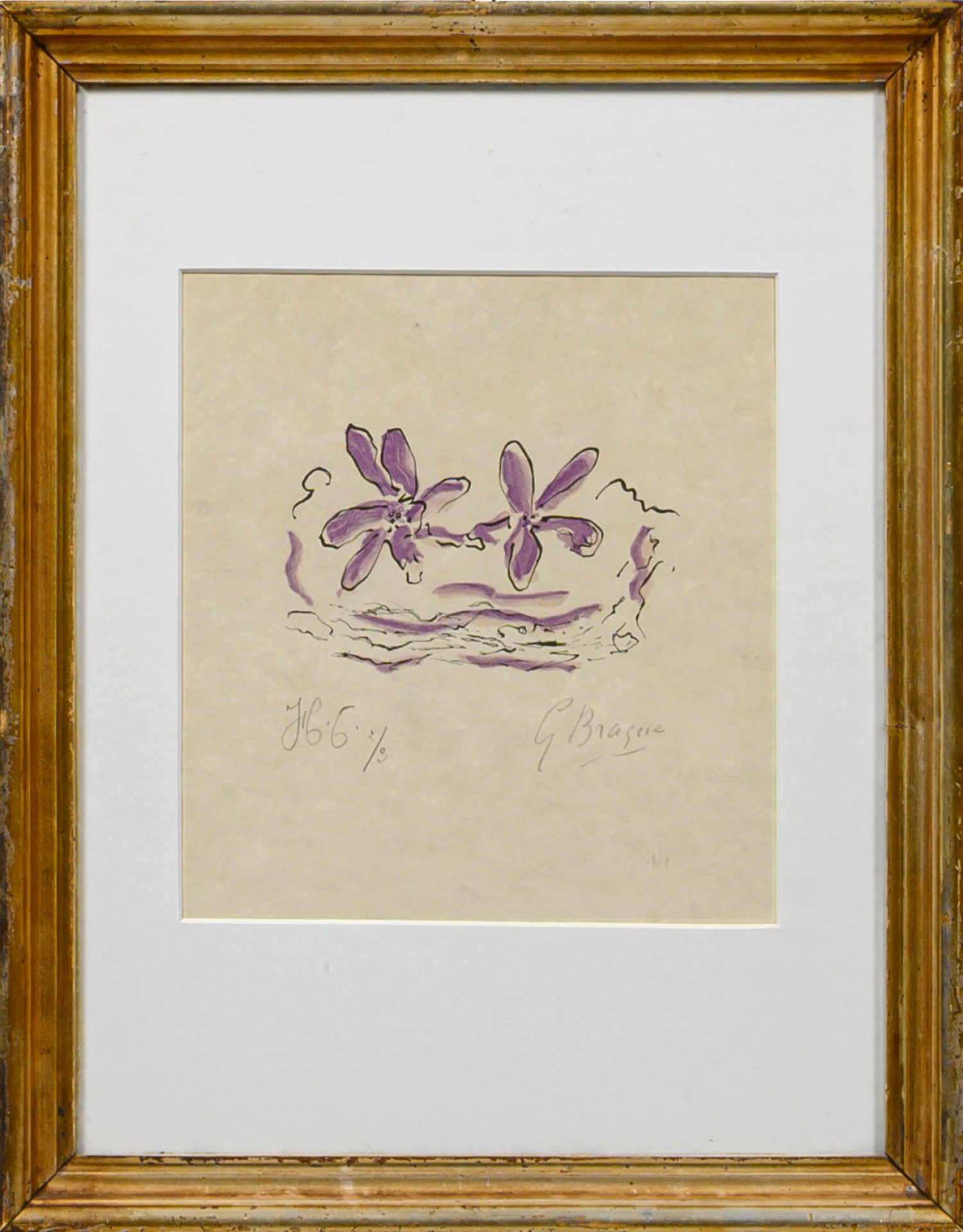 Farblithographie/Japan, 1963. Sign. und nummer. H.C. 2/3 (Hors de Commerce). Aus: René Char und Georges Braque, "Lettera amoroso", Edwin Engelberts, Genf 1963. DRuck bei Mourlot, Paris. Wvz. Vallier 187. 26,5 cm x 24 cm (Passepartoutausschnitt). Rahmen.