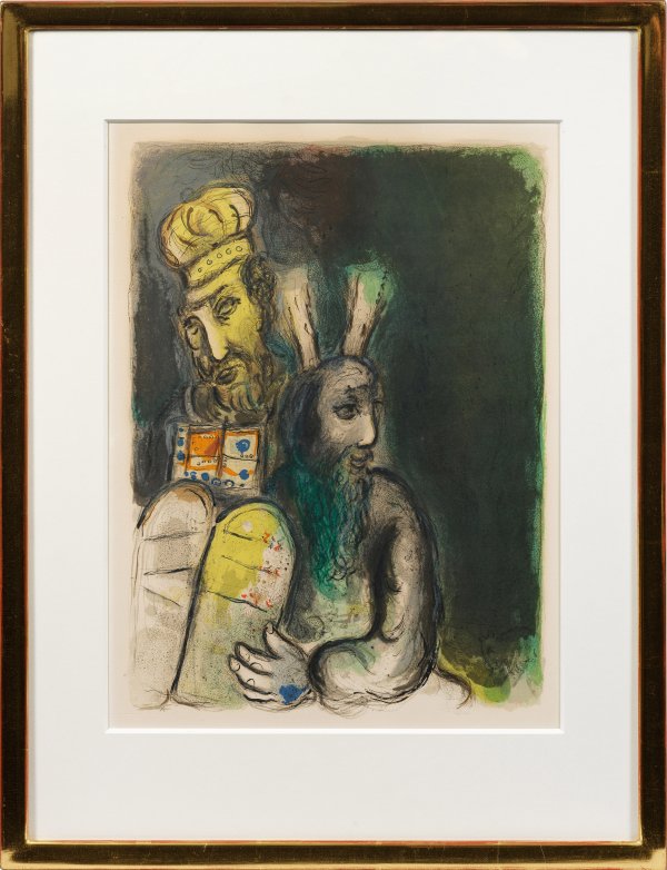 Farblithographie/Arches-Velin (mit Wasserzeichen), 1966. Blatt 22 aus Exodus". Gedruckt vom Atelier Mourlot, Paris; erschienen im Verlag Léon Amiel, Paris und New York, 1966. Wvz. Mourlot 465, Cramer 46. Erschienen in einer Gesamtauflage von 285 Exemplaren, wovon 250 in der Normalauflage auf Velin, 20 auf Japan sowie 15 "hors commerce" sind. Alttestamentliche Szene mit Moses und Aaron in der Priesterkleidung. Darstellung ca. 45,7 cm x 33,2 cm. Rahmen.