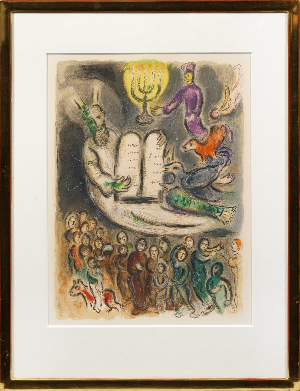 Farblithographie/Arches-Velin (mit Wasserzeichen), 1966. Blatt 14 aus "Exodus" Gedruckt vom Atelier Mourlot, Paris; erschienen im Verlag Léon Amiel, Paris und New York, 1966. Wvz. Mourlot 457, Cramer 46. Erschienen in einer Gesamtauflage von 285 Exemplaren, wovon 250 in der Normalauflage auf Velin, 20 auf Japan sowie 15 "hors commerce" sind. Alttestamentliche Szene mit Moses, die Worte des Herrn verkündend. Darstellung ca. 45,5 cm x 33,5 cm. Rahmen.