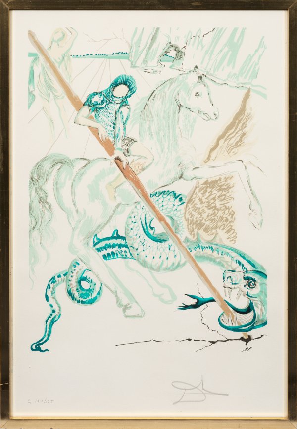 Farblithographie/Velin, 1978/1979. Sign. und nummeriert G 124/125. Blindstempel "Copyright 1978". Eine von vier Farblithographien aus der Folge "Dalí-Retrospektive", 1978/1979. Erschienen im Grafos-Verlag, Vaduz. Wvz. Michler/Löpsinger 1553. Darstellung ca. 58,8 cm x 43,4 cm. Blatt ca. 74,5 cm x 51,5 cm. Rahmen.