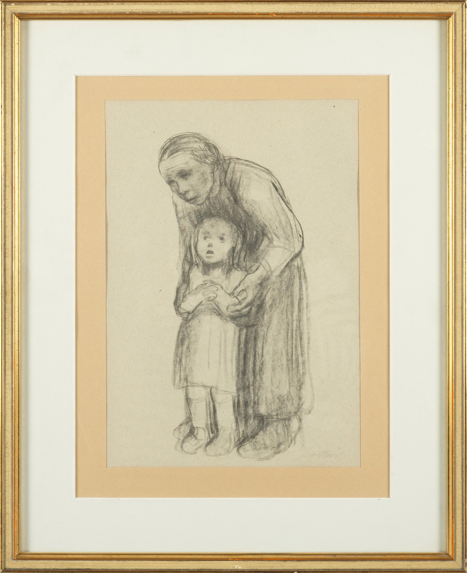 Lithographie nach der ersten (von zwei) Fassung der nach Klipstein um 1933 entstandenen Arbeit (Stein verworfen, vgl. Wvz. Knesebeck 259 f.). Verso weitere Lithographie nach der Zeichnung "Mutter zwei Kinder an sich pressend". Jeweils mit Stempelsignatur. Blatt 37,4 cm x 26 cm. Rahmen.