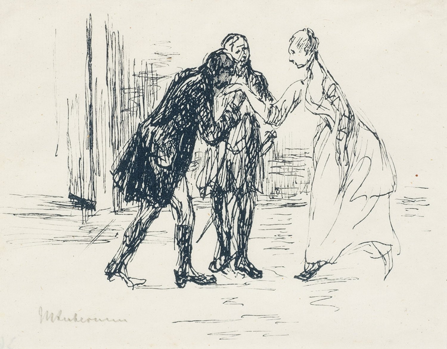 Holzschnitt von Oskar Bangemann (1882 Braunschweig - nach 1942) nach einer Federzeichnung Max Liebermanns, 1920. Sign. (in Bleistift) von Max Liebermann. Wvz. Schiefler 164.L. Erschienen 1922 in einer Auflage von 55 Exemplaren in einer Mappe mit Illustrationen Liebermanns zu der Erzählung "Der Mann von fünfzig Jahren" von Johann Wolfgang von Goethe. Die Holzschnitte wurden auf der Handpresse von der Reichsdruckerei gedruckt, erschienen im Verlag von Bruno Cassirer, Berlin. Neben der Vorzugsausgabe als Mappe erschien auch eine Buchausgabe in einer nummerierten Auflage von 600 Exemplaren. Darstellung ca. 8,1 cm x 10,5 cm. Rahmen.