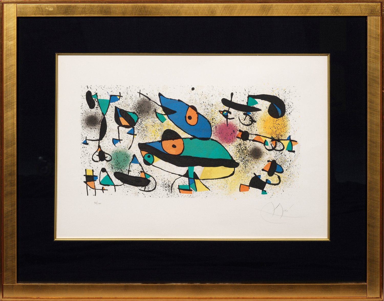 Farblithographie/Velin, 1974. Sign. u. nummeriert 98/100. Motiv erschienen für "Miró Sculptures" von Alain Jouffroy und Joan Teixidor. Erschienen bei Maeght, Paris. Vgl. Wvz. Cramer 949. Darstellung ca. 30 cm x 56 cm. Ca. 47 cm x 70 cm (Passepartout). Rahmen.