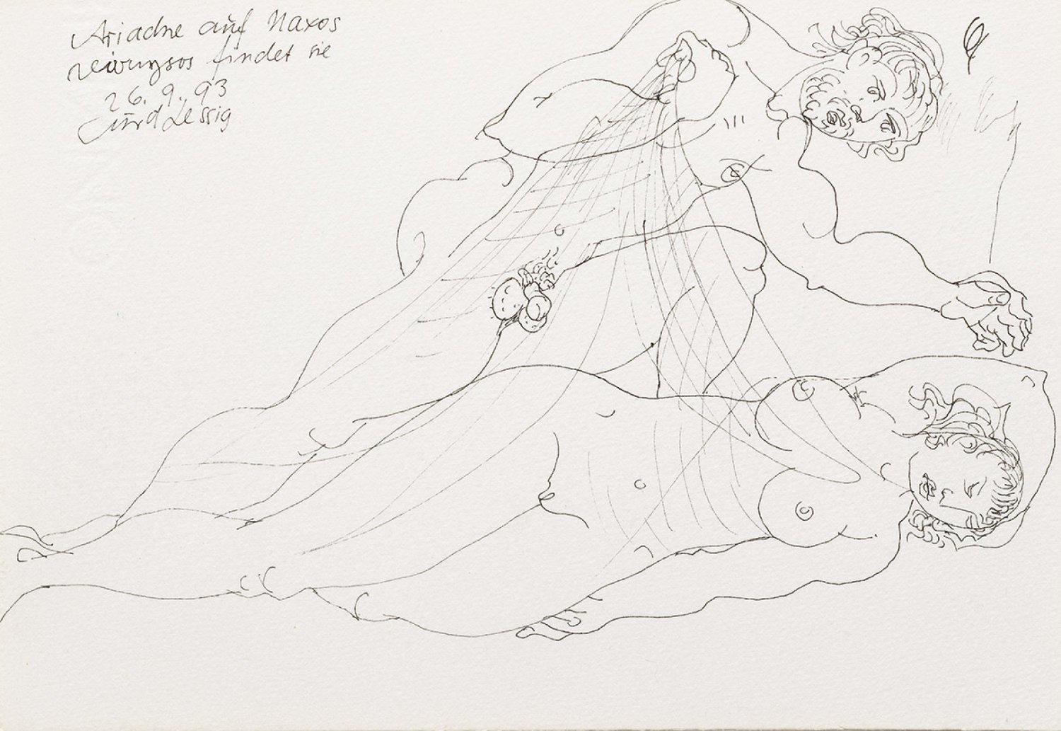 Dynamische, auf feine Konturlinien reduzierte Figurenkompositionen. Lessig, der 1939-1940 die Zeichenklasse bei Heiner Dikreiter in Würzburg besuchte, beschäftigte sich neben Malerei und Grafik intensiv mit der Glasfenstergestaltung, Fresken, Wandmalereien und Mosaiken. Tinte/Bütten (teilw. Wasserzeichen von Fabriano). Teilw. sign. u. dat. 1992-1994. Ein Blatt bez. "Ariadne auf Naxos (/) Dionysos findet sie". 14,7-15,8 cm x 20,8-24 cm. Rahmen.