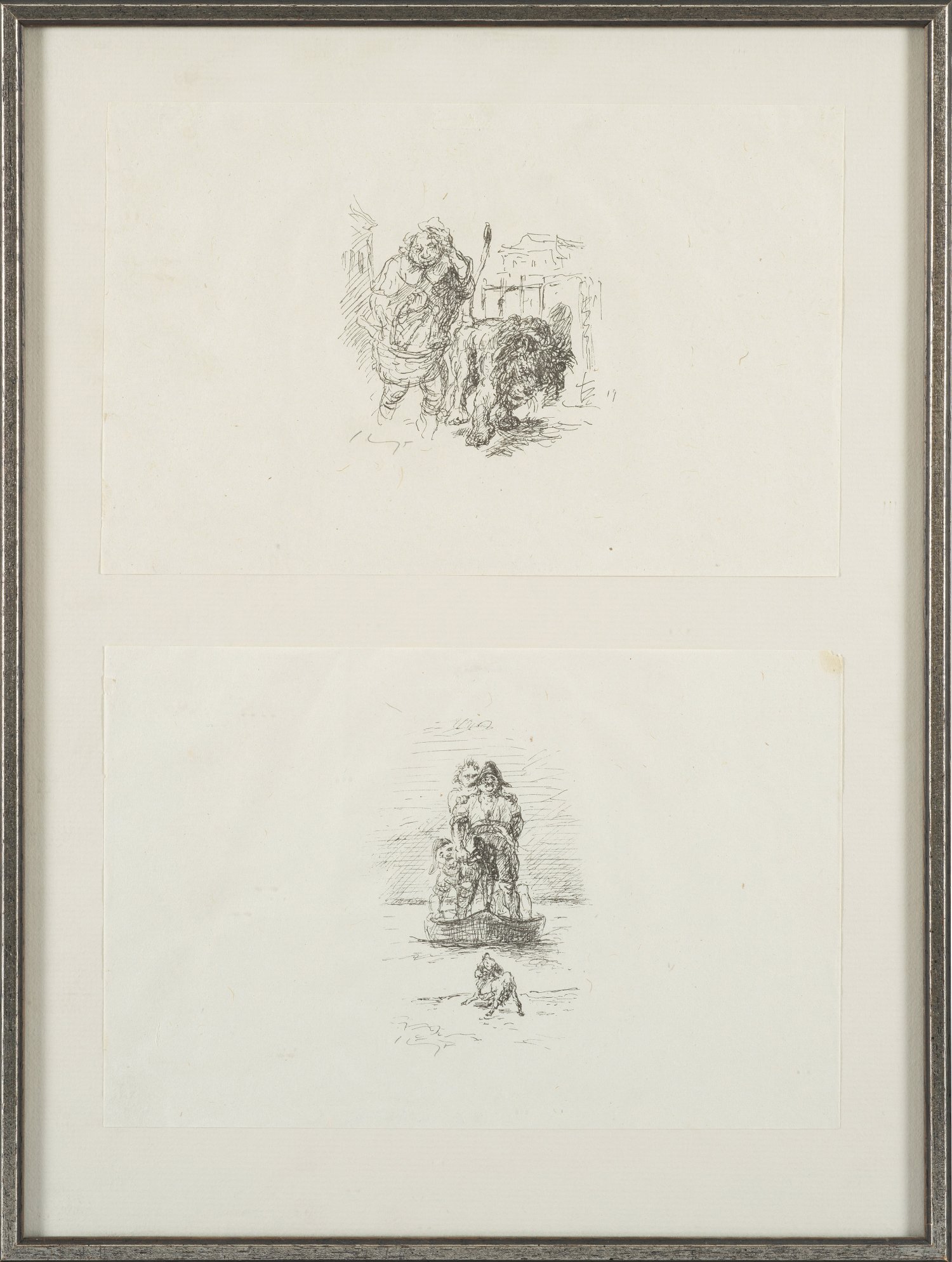 Lithographien/Papier. Jeweils sign.; Zwei Blätter mit Illustrationen zu Märchen der Gebrüder Grimm. Blatt 15,6 cm x 24,1 cm und 15,4 cm x 24 cm. Sammelrahmen.
