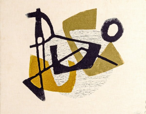 Textildruck/Leinen, kaschiert auf Karton, 1955. R. u. sign. und dat. (19)55. 46,5 cm x 59 cm.