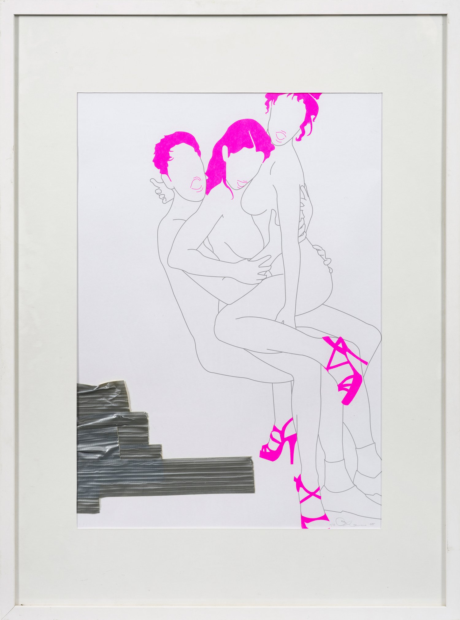 Farbserigraphie und silberfarbenes Panzertape-Geweband (bzw. Gaffatape)/Karton. Sign., dat. (20)05 u. nummeriert 1/6. Durch die Pop Art der 1960er/1970er Jahre und Allen Jones inspirierte, explizit erotische Arbeit, die durch das Panzertape zusätzlich auf Bondage und BDSM anspielt. 58 cm x 41,5 cm (Passepartoutausschnitt). Rahmen.