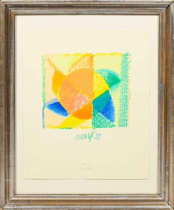 Farbserigraphie/Velin, 1999/2000. Sign., nummeriert 20/60 sowie dat. (20)00. Im Druck nochmals sign. und dat. (19)99. Darstellung ca. 28 cm x 31 cm. Blatt 55 cm x 45 cm. Rahmen.
