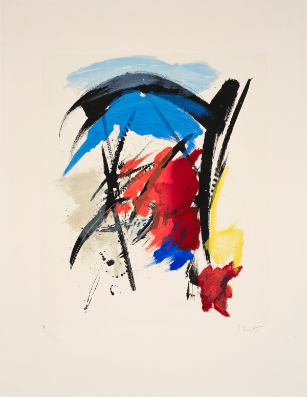 Farbaquatintaradierung/Velin von Arches (Wasserzeichen). Sign. und nummeriert 33/80. Kraftvolles, dynamisches Blatt des bedeutenden Informel-Künstlers. Blatt 85,5 cm x 67 cm. Plattenmaß 57,9 cm x 48,5 cm.