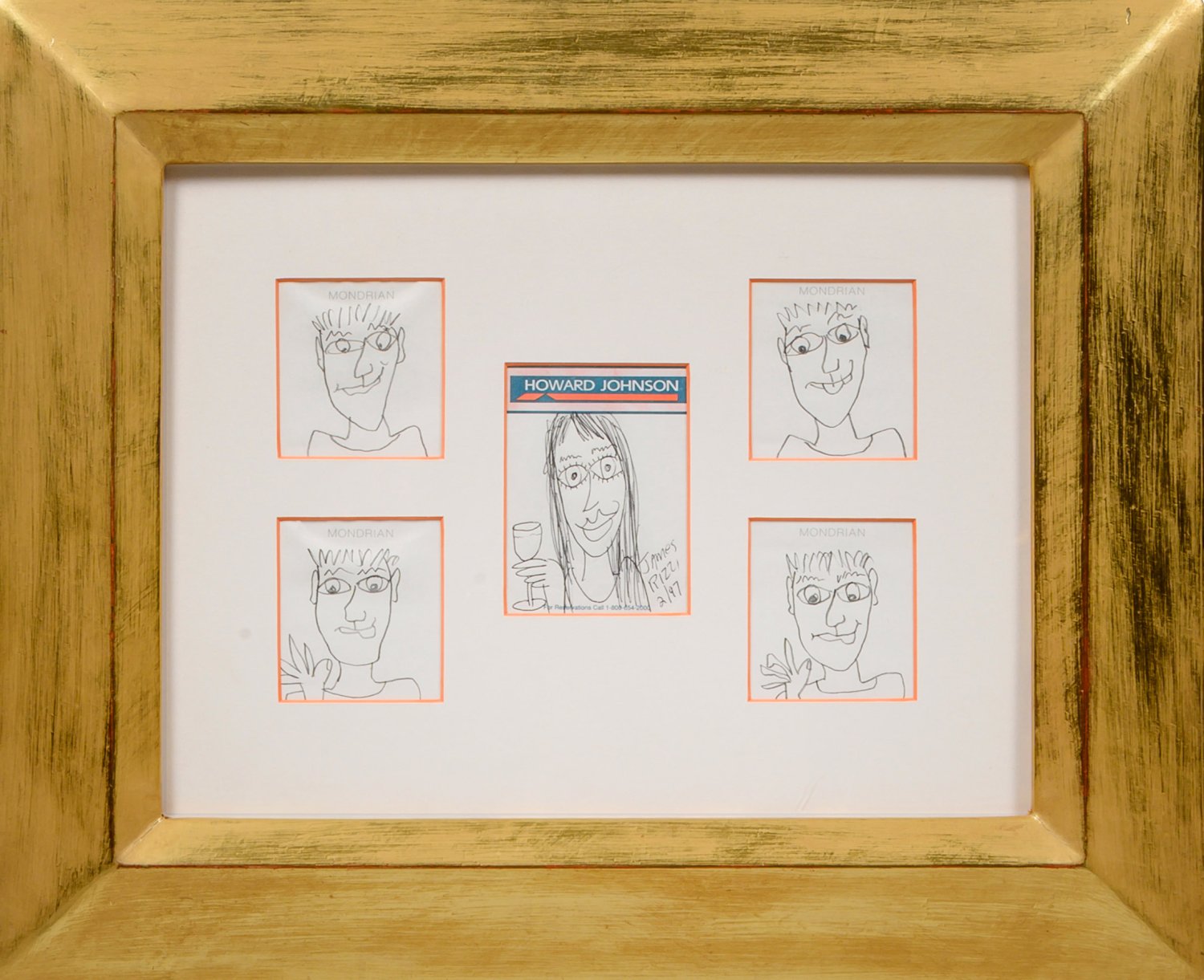 Comichaft reduzierte Kopfstudien einer Frau mit Weinglas sowie von vier Männern, die vermutlich Selbstdarstellungen des Künstlers sind. In den malerischen Ausdrucksmitteln drastisch vereinfachte und an Kinderzeichnungen erinnernde Köpfe gehören längst zu den Ikonen der Pop Art-Kunst James Rizzis. Kugelschreiber bzw. Bleistift/Papier. Sign. und dat. 2/(19)97. 9,8 cm x 7,1 cm bzw. 7 cm x 6,4 cm (Passepartoutausschnitte). Sammelrahmen.