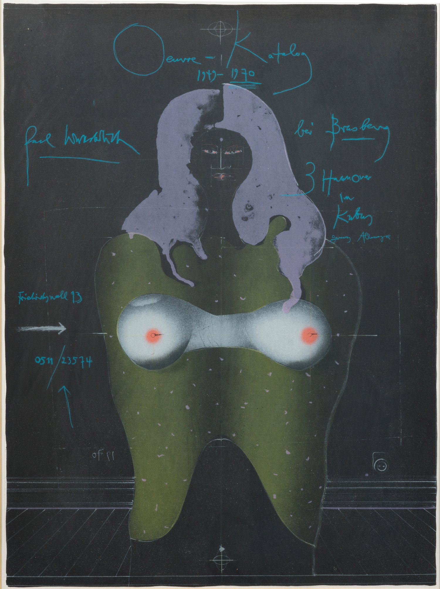 Farblithographie/Offsetpapier, 1970. Druck Mourlot, Paris. Im Stein sign. u. spiegelbildlich dat.; Eins von insgesamt 502 Exemplaren. Wvz. Riediger 390. Plakat mit Text für eine Ausstellung bei Brusberg, Hannover. Darstellung 67,5 cm x 50,3 cm. Rahmen.