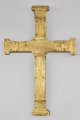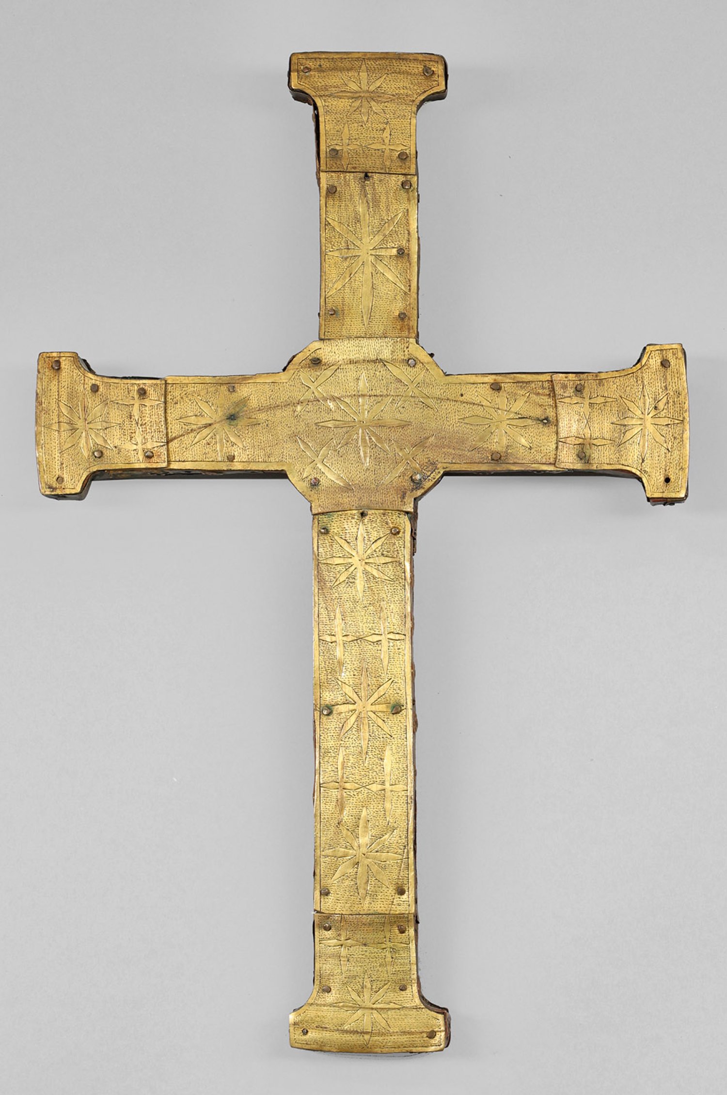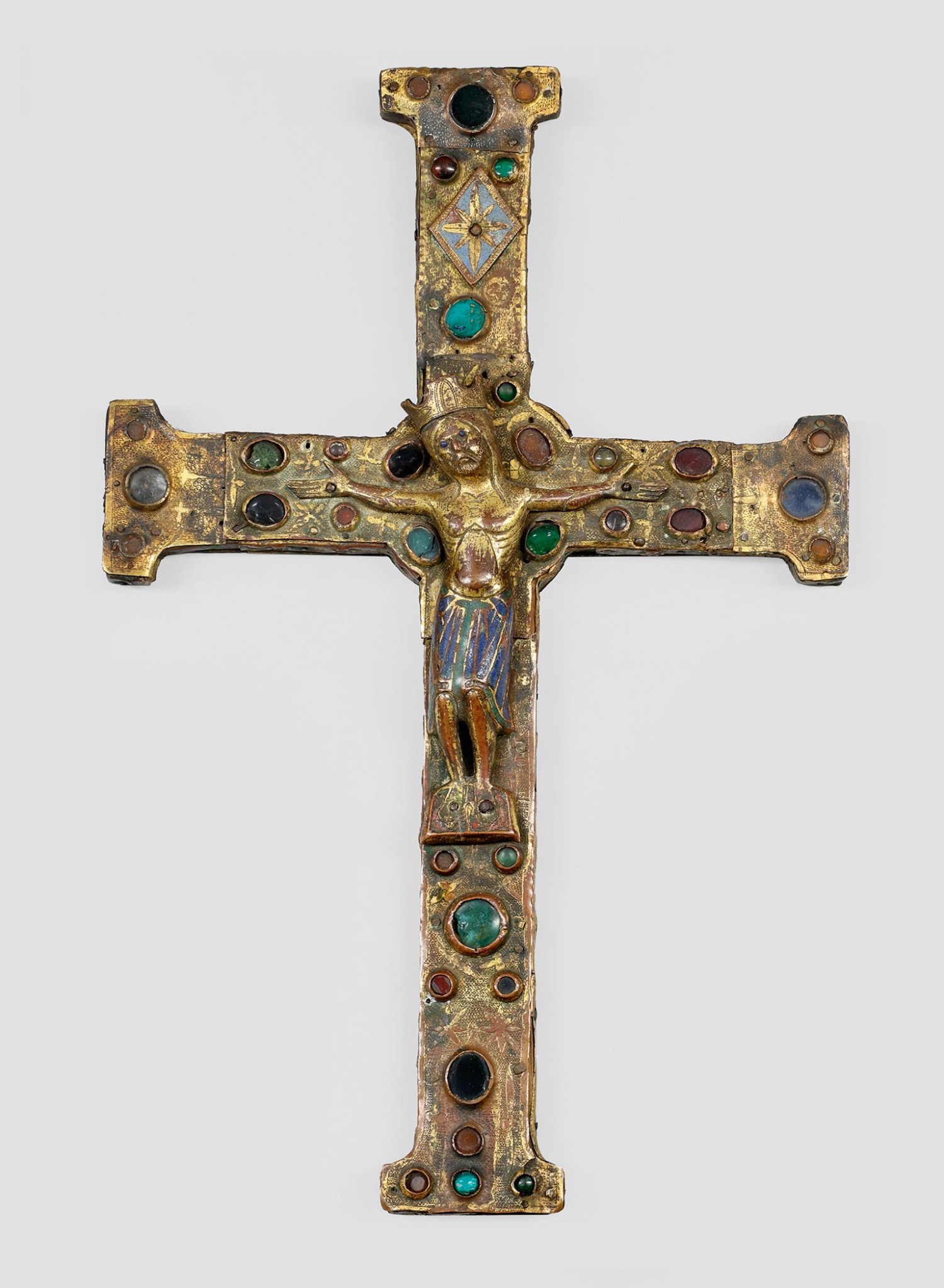 Holzkern, beschlagen mit ziseliertem, punziertem und vergoldetem Kupfer, auf der Vorderseite reich besetzt mit ovalen und runden Glascabochons und einer Champlevé-Email-Plakette; der rücks. hohle Corpus Christi in Kupfer, partiell ziseliert bzw. getrieben, vergoldet und emailliert. Das Kreuz mit akzentuierten Kreuzendungen, auf Vorder- und Rückseite mit flächendeckendem Dekor aus Sternen. Der Gekreuzigte im Viernageltypus mit langem, blau emailliertem Lendentuch und blauen, eingelassenen Augen, die Arme horizontal ausgebreitet, den gekrönten, großen Kopf zu seiner rechten Seite geneigt. Dieses museale Prozessionskreuz gehört zu der von Stohlman 1950 (op.cit.) als "Sterngruppe" bezeichneten Gruppe von Emaille-Objekten aus Limoges, die applizierte Figuren auf Metallgrund aufweisen und die mit Sternen und Cabochons gearbeitet sind. Weitere dieser Gruppe zuzuordnende Limoges-Prozessionskreuze befinden sich laut Stohlman im Musée de Cluny, Paris (Inv.-Nr. 985) und im Musée Mathon-Durand in Neufchâtel-en-Bray (Stohlman, Nr. 11). Ein Stein fehlt. H. 38,5 cm; B. 25 cm.