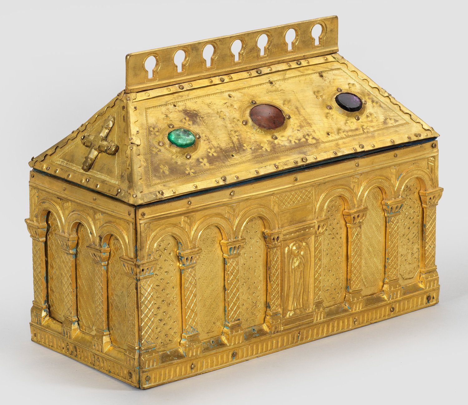 Vergoldetes Kupferblech auf Holz. Rechteckiger Korpus, scharnierter Deckel in Form eines Satteldachs mit durchbrochen gearbeitetem First und Farbsteinbesatz. Korpus umlaufend reliefiert mit Rundbögen über Säulen, die den Blick auf mit unterschiedlichen Mustern punzierte Hintergründe freigeben. Zentral an der Schauseite zwischen zwei Säulen ein Engel mit über der Brust gefalteten Händen und Heiligenschein. Das Dach an den Stirnseiten jeweils mit einem Kreuz besetzt. Innen blauer Samt. H. 21 cm. 13 cm x 28 cm.