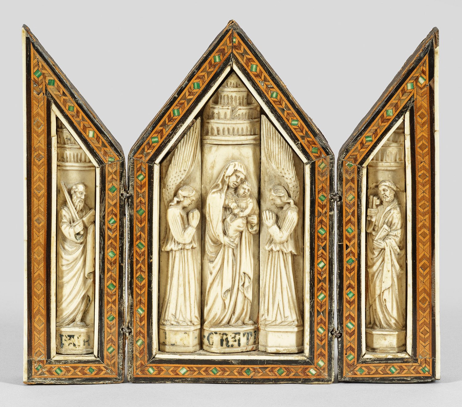 Knochen (Bein), im Relief geschnitzt; Holz und Ebenholz(?) mit geometrischen Filets in teils gefärbtem Knochen; der Korpus beschlagen mit braunem Leder. Das Triptychon mit Spitzgiebel, das zentrale Feld zeigt die stehende Maria mit Kind vor einem hohen, runden Turm (wohl das Himmlische Jerusalem symbolisierend), flankiert von zwei großen, adorierenden Engeln. In den beiden Flügeln Darstellungen der Apostel Paulus und Petrus vor gleichartigen Türmen. Offen 18 cm x 21,3 cm; 18 cm x 10,3 cm.