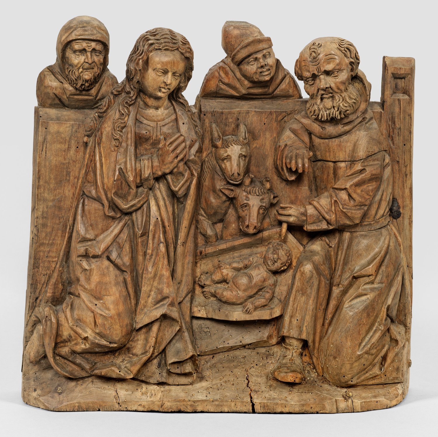 Lindenholz, geschnitzt. Relief die Geburt Christi darstellend, ursprünglich wohl Teil eines Flügelaltares. Die szenische Darstellung ist integriert in den vor den Toren Bethlehems gelegenen Stall, dessen angedeutetes Ständerwerk die Szenerie flankiert. Sie folgt der prägenden Weihnachtsvision der Hl. Birgitta von Schweden (1303 - 1373), in der sie beschrieb, wie die am Boden kniende Maria mit gefalteten Händen das in einer Krippe liegende, unbekleidete Kind anbetet. Daneben, der in der Tracht eines Pilgers gekleidete Hl. Joseph, ursprünglich eine Kerze in Händen haltend. Im Hintergrund zwei Hirten. Rücks. Reste eines alten Etiketts mit der Nr. 217, sowie Brandnummer 218 und alte Eisenaufhängung. Minim. Reste polychromer Fassung. Minim. best. und rest.; 36 cm x 34 cm x 8 cm.