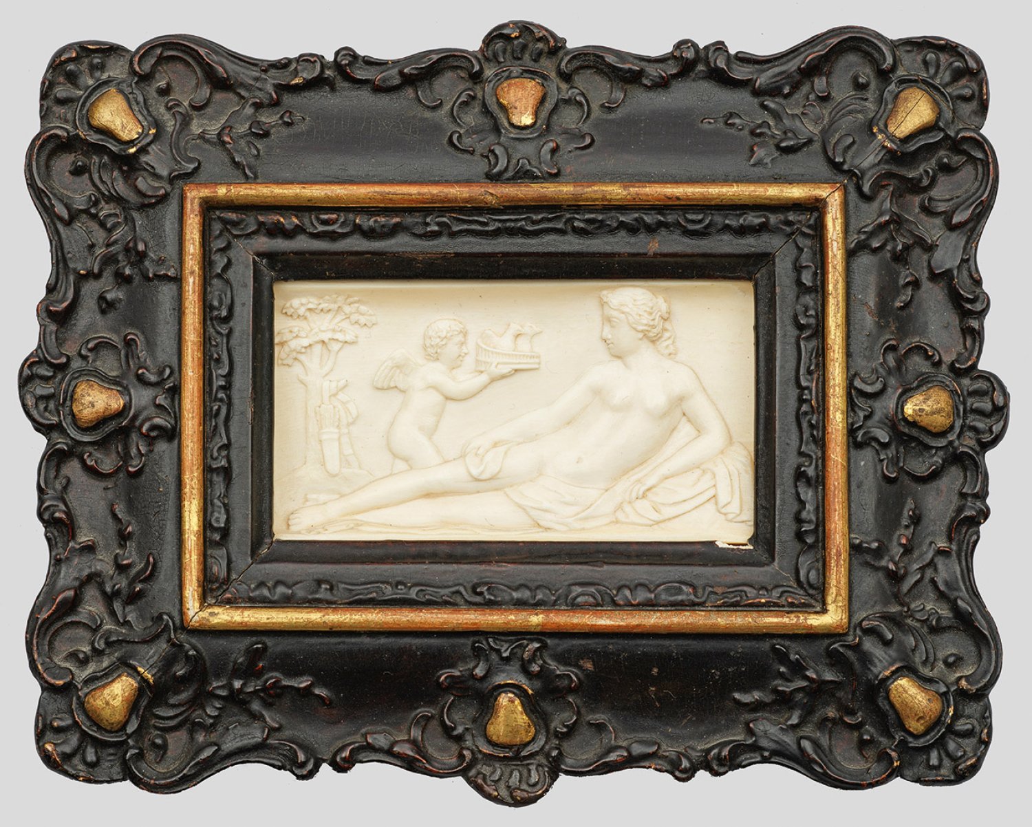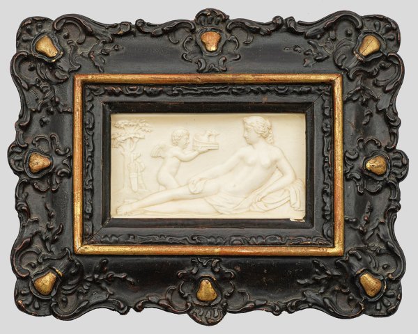 Elfenbein, geschnitzt. Ebonisierter und vergoldeter Holzrahmen mit feinem Rocaillenrelief. Szenische Darstellung der ruhenden, bis auf ein Tuch unbekleideten Venus, die ihren Körper dem Betrachter zugewendet hat. Sie richtet ihren Blick auf den hinter ihr stehenden Amor, der ihr einen Korb mit einem Taubenpaar als Liebessymbol darbringt. Relief 5 cm x 9 cm; Rahmen 14,2 cm x 17,8 cm.