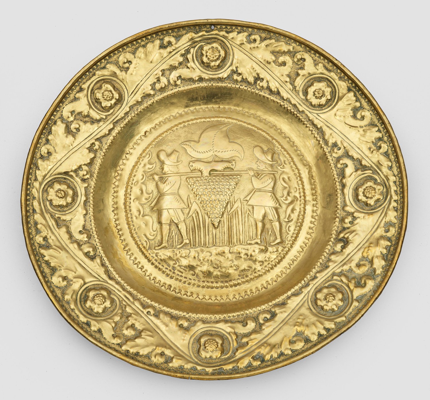 A Dutch brass alms dish depicting Josua and Kaleb carrying grapes.