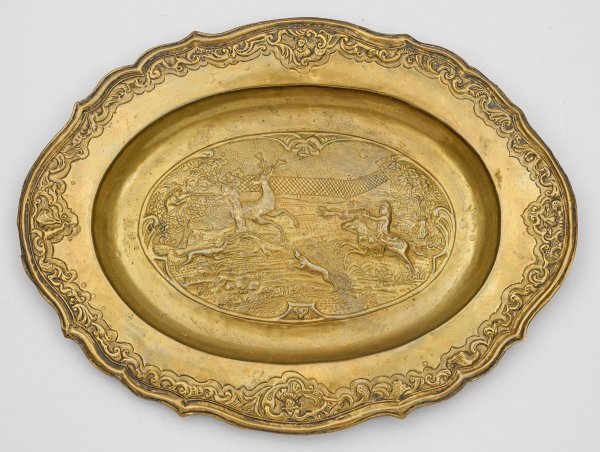 Ovale Grundform mit vertieftem Spiegel und geschweiftem Rand. Spiegel mit getriebenem Relief einer Hirschjagd. Am Rand Rocaillendekor, in vier Kartuschen zwei Porträts sowie zwei Blumendarstellungen. 48,5 cm x 36 cm.