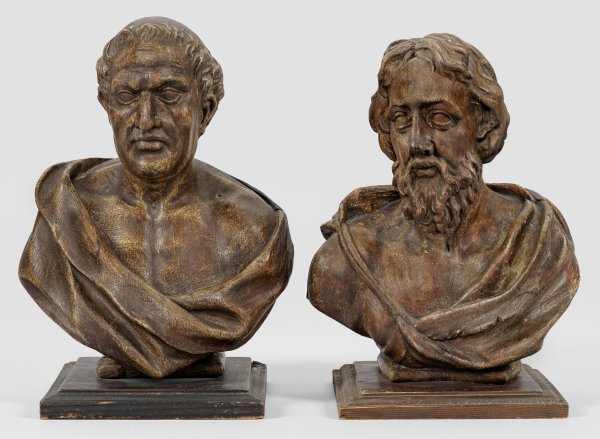 Gegenstücke. Lindenholz, geschnitzt und dunkelbraun gebeizt, später auf einem nachträglichen, flachen, gleichfarbigen Holzsockel montiert. Vollplastische Darstellungen der bedeutenden athenischen Staatsmänner Demosthenes (384 - 322 v. Chr.) und Solon (um 640-560 v. Chr.), gewandet in weite, tief und voluminös drapierte Togen. Da Demosthenes auch als Redner und Solon auch als Lyriker, weiser Reformer und Gesetzgeber einen sich über Platon, Aristoteles und Cicero bis in die Neuzeit erstreckenden Nachruhm erhielt, konnten diese im Barock als ideale, vorbildhafte Persönlichkeiten im Interieur einer barocken Bibliothek dienen. Ges.-H. 32,5 cm-34 cm.