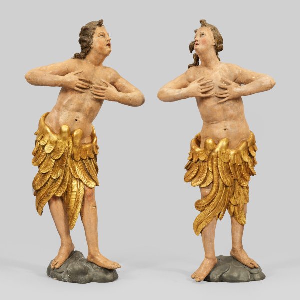 Gegenstücke. Lindenholz, geschnitzt und gefasst, rücks. am Körper ausgehöhlt. Auf kleinen Wolkensockeln im Kontrapost stehende, sich nach links bzw. recht wendende, ikonographisch außergewöhnliche, jünglinghaft gestaltete, unbekleidete Engel, die Scham und Hüften rock- bzw. lendenschurzartig durch die großen, niedrig angesetzten Flügel bedeckend und die Hände in lebendig bewegter Pose vor die Brust legend. Die beiden Engel dürften thematisch und aufgrund der Komposition einst einen Altar flankiert haben. Für eine Zuschreibung an Johann Peter Schwanthaler den Älteren sprechen die spezifische Darstellung der Körper, der Gesichtstypus mit leicht geöffnetem Mund und die Fiederung der Flügel. Der spätbarocke, oberösterreichische Künstler entstammte der bedeutenden Bildhauerdynastie, er war der dritte Sohn von Johann Franz Schwanthaler und ein Enkel von Thomas Schwanthaler. 1758/59 übernahm er die Schwanthaler-Werkstatt in Ried noch zu Lebzeiten seines Vaters und führte sie zu künstlerischem und wirtschaftlichem Erfolg. Mit seiner Werkstatt (in der auch sein 1722 geborener Bruder Johann Ferdinand arbeitete) führte er zahlreiche Kirchenausstattungen, Altar- und Einzelskulpturen aus, darunter eine Reihe von Engeln, außerdem Andachtsbildwerke, Kruzifixe und Kreuzigungsgruppen sowie Pietà-Darstellungen und Krippen. Minim besch.; H. 114 cm.
