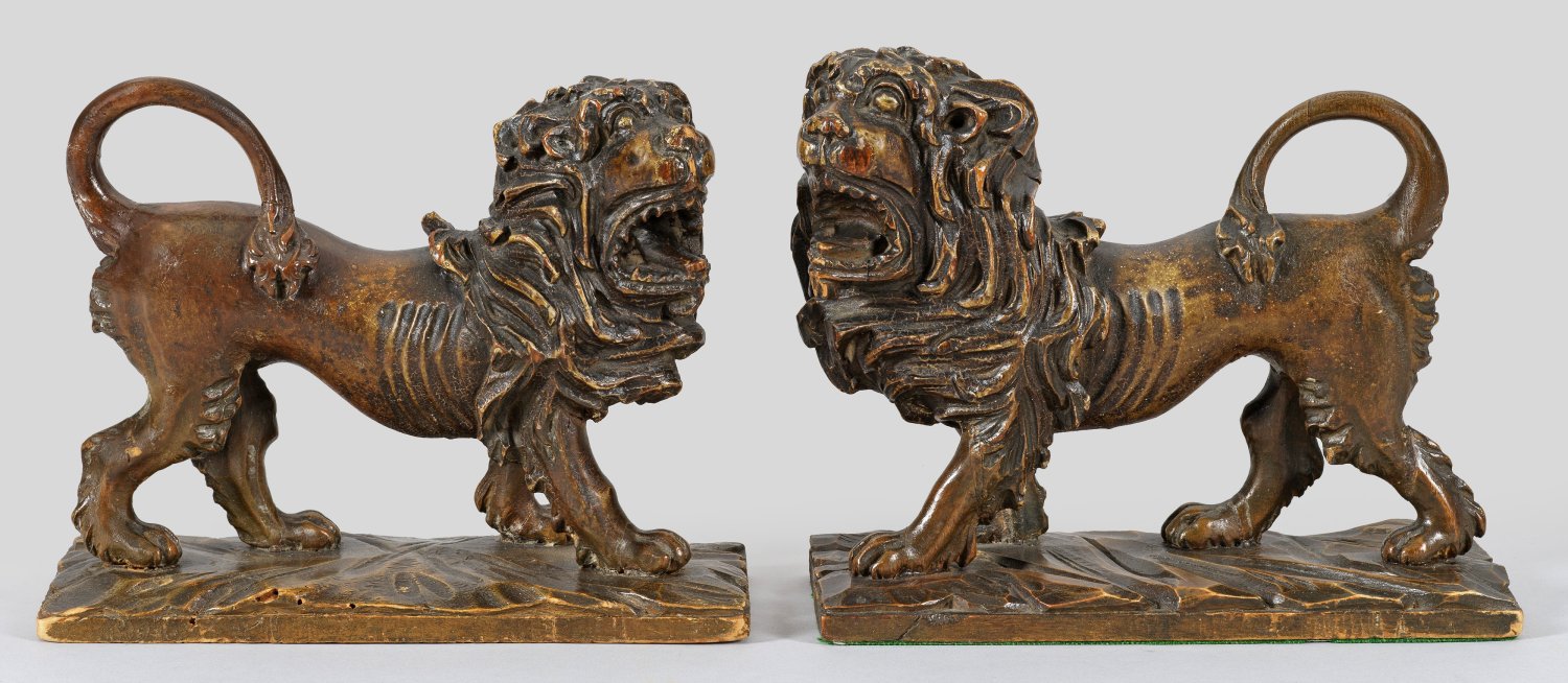 Gegenstücke. Lindenholz, dunkelbraun gebeizt. Auf rechteckiger Plinthe stehende, vollplastische Löwen, ihren Kopf mit aufgerissenem Maul nach rechts bzw. links wendend. H. 14,8 cm-15,8 cm.
