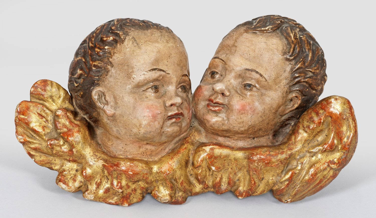South German sculptor active 18th/19th century. Carved, painted and gilt limewood group of two Cherub Heads.