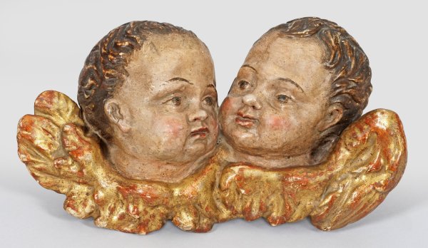 Wohl Lindenholz, geschnitzt, farbig gefasst und vergoldet. Vollplastisch, rücks. leicht abgeflachte Darstellung mit einander zugewandten Köpfen. Ca. 19 cm x 34 cm 11 cm.