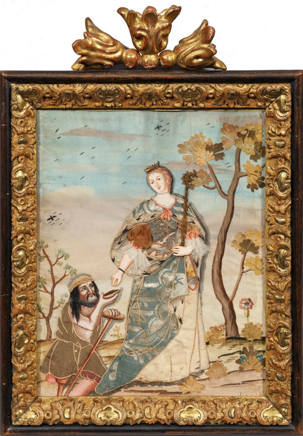 Papier und Stoff. Darstellung einer stehenden Fürstin oder Königin mit Zepter und Krone in prunkvollem Kleid und Hermelinmantel, vor ihr ein kniender, versehrter Bettler; baumbestandene Landschaftsstaffage mit Blumen. Kleidung aus passend zugeschnittenen, unterschiedlichen Stoffstücken, u. a. Seide und Seidenbrokat; der Hintergrund und die Papierelemente mit Gouache- oder Temperamalerei. Bildmaß ca. 27,5 cm x 22 cm. Ebonisierter u. vergoldeter Rahmen, wohl original. Gesamtmaß ca. 39,5 cm x 28,2 cm.