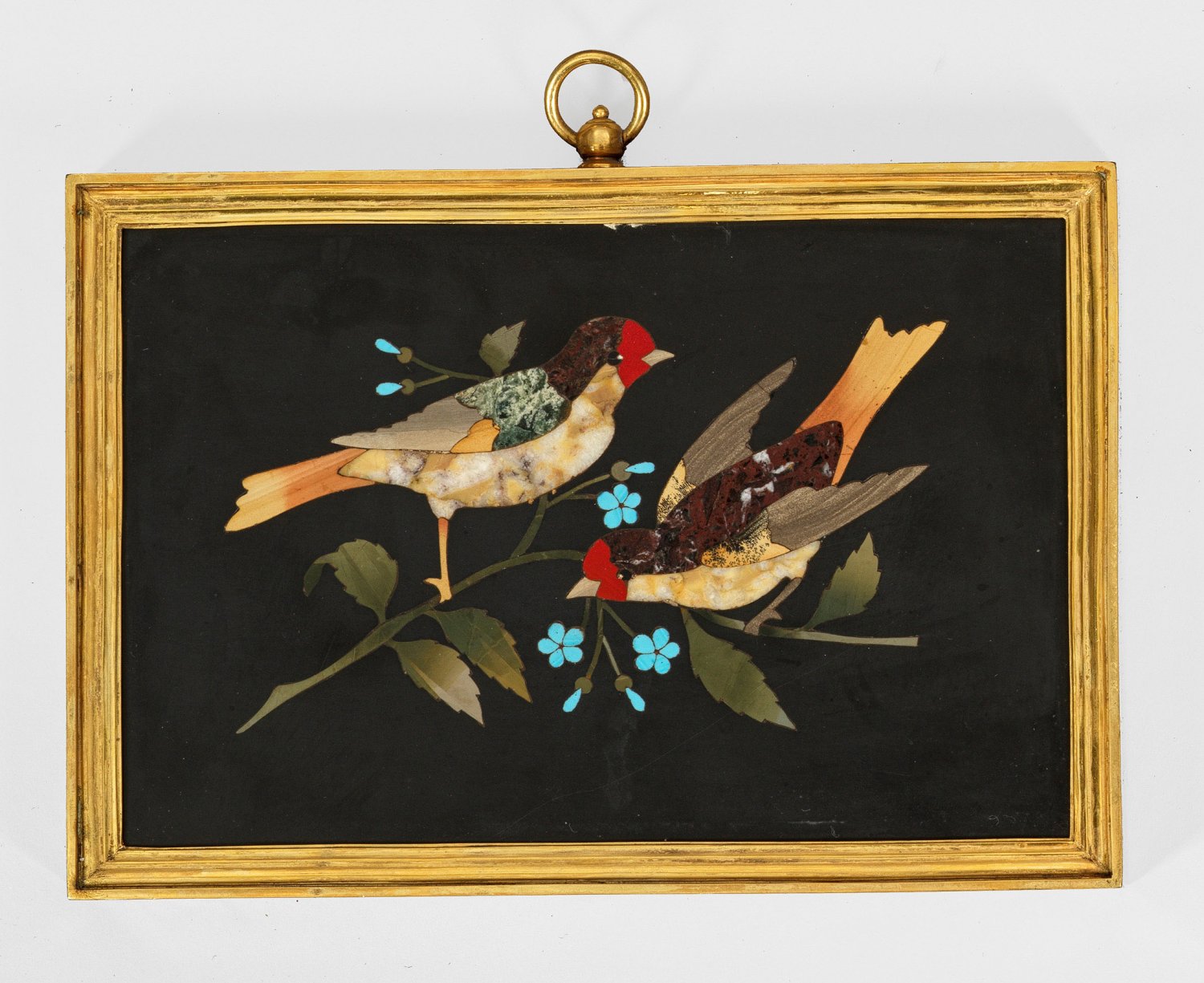 Schwarzer Marmor mit Intarsien aus verschiedenen Schmucksteinen in sog. Pietra Dura-Technik. Szenische Darstellung von zwei Singvögeln auf einem Ast mit türkisfarbenen Blüten. 17,5 cm x 11,5 cm. Vergoldeter Messingrahmen.