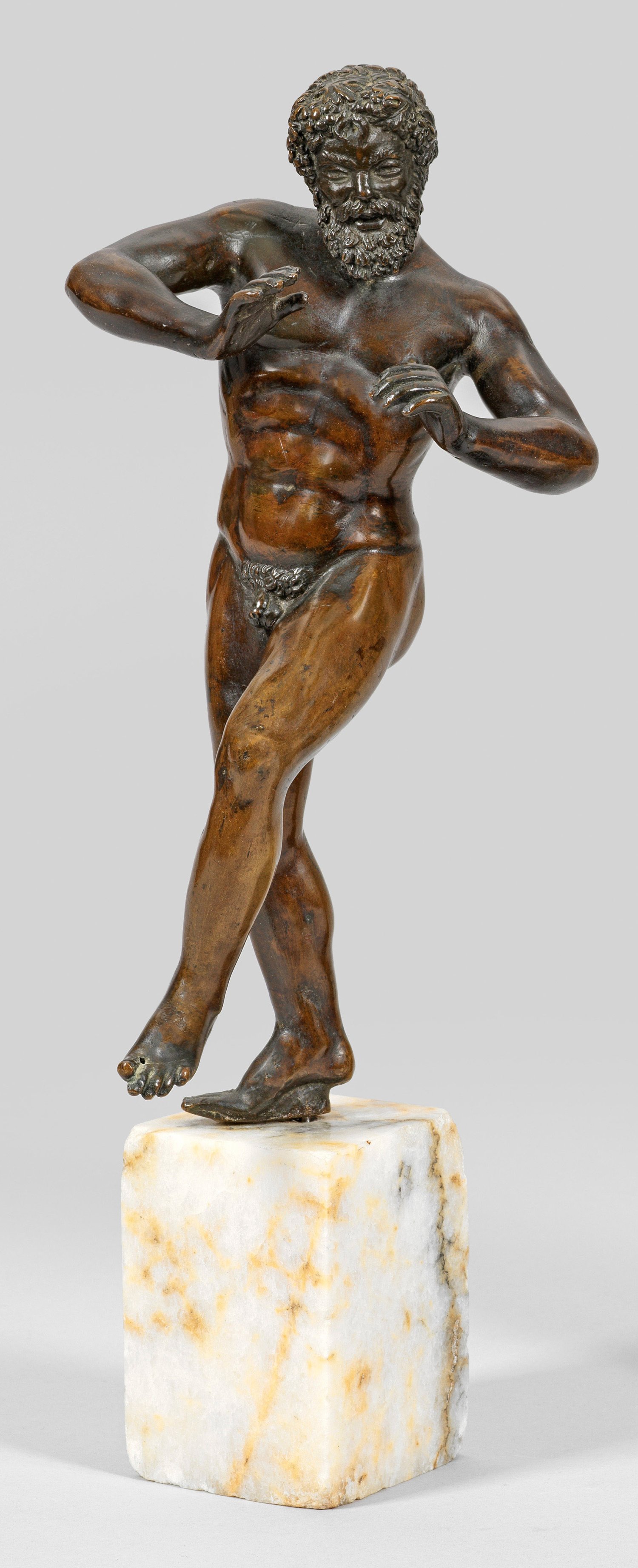 Bronze, dunkelbraun patiniert; Marmorsockel. Grand Tour-Objekt. Vollplastische Aktfigur des auf einem Bein stehenden, vollbärtigen Bacchus mit Weintrauben und -laub im Haar, wohl nach einem antiken römischen Original. Ges.-H. 34 cm.
