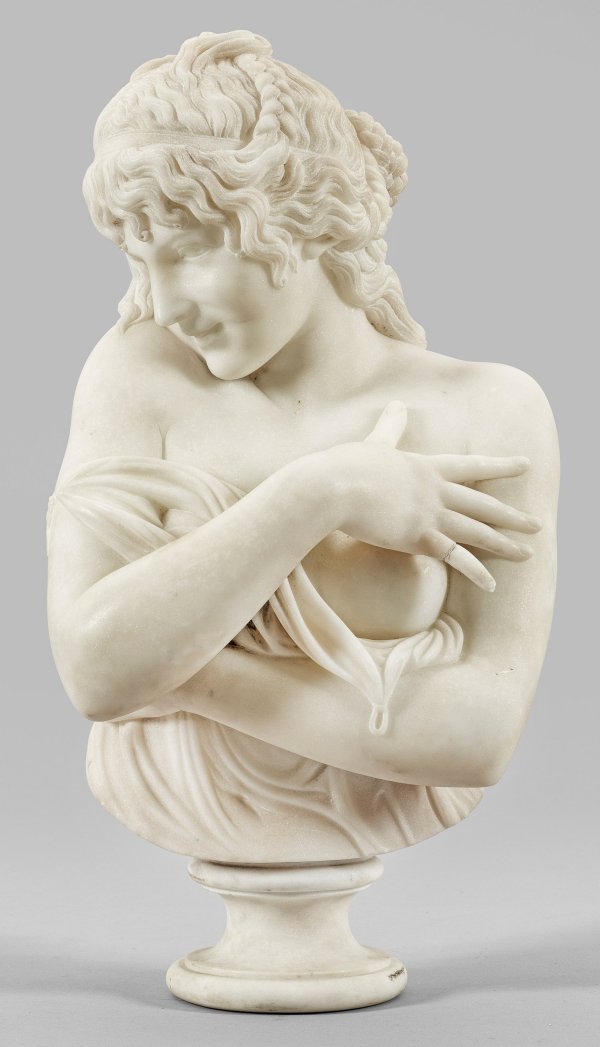 Weißer Carrara-Marmor. Vollplastische, wohl Ende des 19. Jhs. ausgeführte Halbfigur bzw. Büste einer jungen Frau mit schelmischem Lächeln, die schamhaft versucht ihre teilw. entblößte Brust zu bedecken und hierbei nach rechts unten blickt. Ihre kunstvolle Frisur aus ineinander verschlungenen Zöpfen wird von einem Stirnband gehalten, mit ihren über der Brust gekreuzten Händen hält sie ein im antiken Stil drapiertes Kleid. Die Skulptur gehörte im 19. Jh. zu den vielfach kopierten Werken Houdons (ein Exemplar u. a. in der Staatsgalerie Stuttgart). Der klassizistische Bildhauer gehörte zu den gefragtesten Künstlern seiner Zeit, er war außer in Frankreich auch in Deutschland, Russland, Italien und den USA tätig. Als erfolgreichster Porträtbildhauer verstand er es, wie kaum ein anderer, die feinen Züge seiner Modelle zu erfassen und deren Charakter in Marmor umzusetzen. Ein Finger geklebt. H. 54 cm.