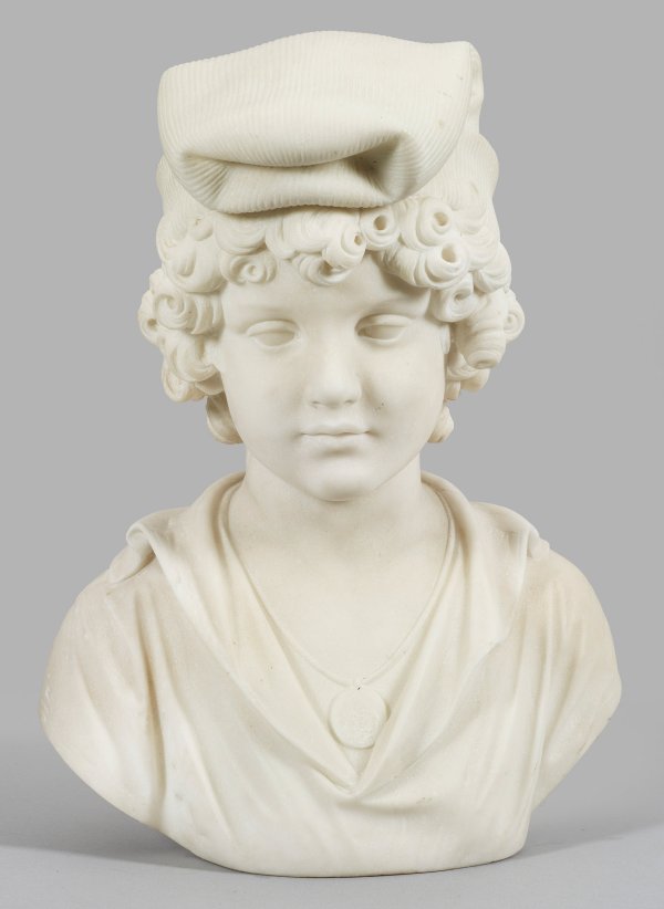 Weißer Carrara-Marmor. Vollplastische Büste eines jungen Fischerknaben mit reich gelocktem Haar und traditioneller Mütze auf dem Kopf, am Hals eine Kette mit Medaillon. Im Detail fein ausgeführte Darstellung mit subtil differenzierter Oberflächenbehandlung und künstlerisch meisterhafter, feinfühliger Behandlung der weichen, noch ganz kindlichen Gesichtszüge. Ger. best.; H. 42,5 cm.