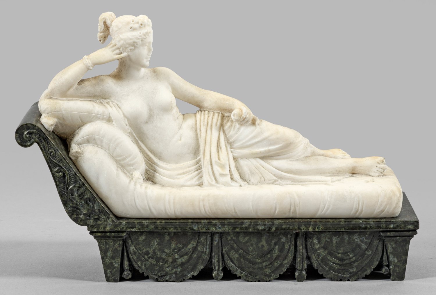 Alabaster und Serpentin. Auf einer Récamiere ruhender, weiblicher Halbakt mit aufgestütztem rechten Arm, nur mit einem Lendentuch bedeckt. Auf Wunsch ihres Bruders Napoleon war Pauline Bonaparte (1780-1825) in zweiter Ehe mit Camillo Borghese verheiratet, der 1805 den Bildhauer Antonio Canova beauftragte, seine Gemahlin als siegreiche Venus in Marmor zu porträtieren. Der Apfel in Venus' Hand verweist auf ihren Sieg beim Paris-Urteil, denn Athena und Minerva waren ihr in Aussehen und Anmut unterlegen. Diese verkleinerte, sehr feine, wohl im 19. Jh. in Italien ausgeführte Alabaster-Version weicht in einigen Details vom Original in der Villa Borghese ab. Minim. best.; H. 18 cm. B. 27,5 cm.