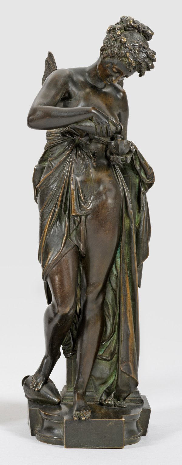 Bronze, dunkel patiniert. Guss des 19. Jhs.; Neoklassizistische Statuette der Psyche als Halbakt mit kleinen Schmetterlingsflügeln, eine Lampe mit Öl befüllend. Carrier-Belleuse war einer der bedeutendsten, schaffensreichsten und thematisch vielseitigsten Bildhauer der Epoche Kaiser Napoleon III. und der Belle Epoque. Er studierte an der École des Beaux-Arts in Paris und debütierte schon 1851 im Salon. Viele Werke wurden von Napoleon III. angekauft, den er ebenso porträtierte wie andere Persönlichkeiten seiner Zeit. In seinem Atelier arbeitete 1864-1870 der befreundete Auguste Rodin als Assistent, mit dem er seit 1875 auch als Leiter der Manufaktur Sèvres kooperierte. H. 37 cm.