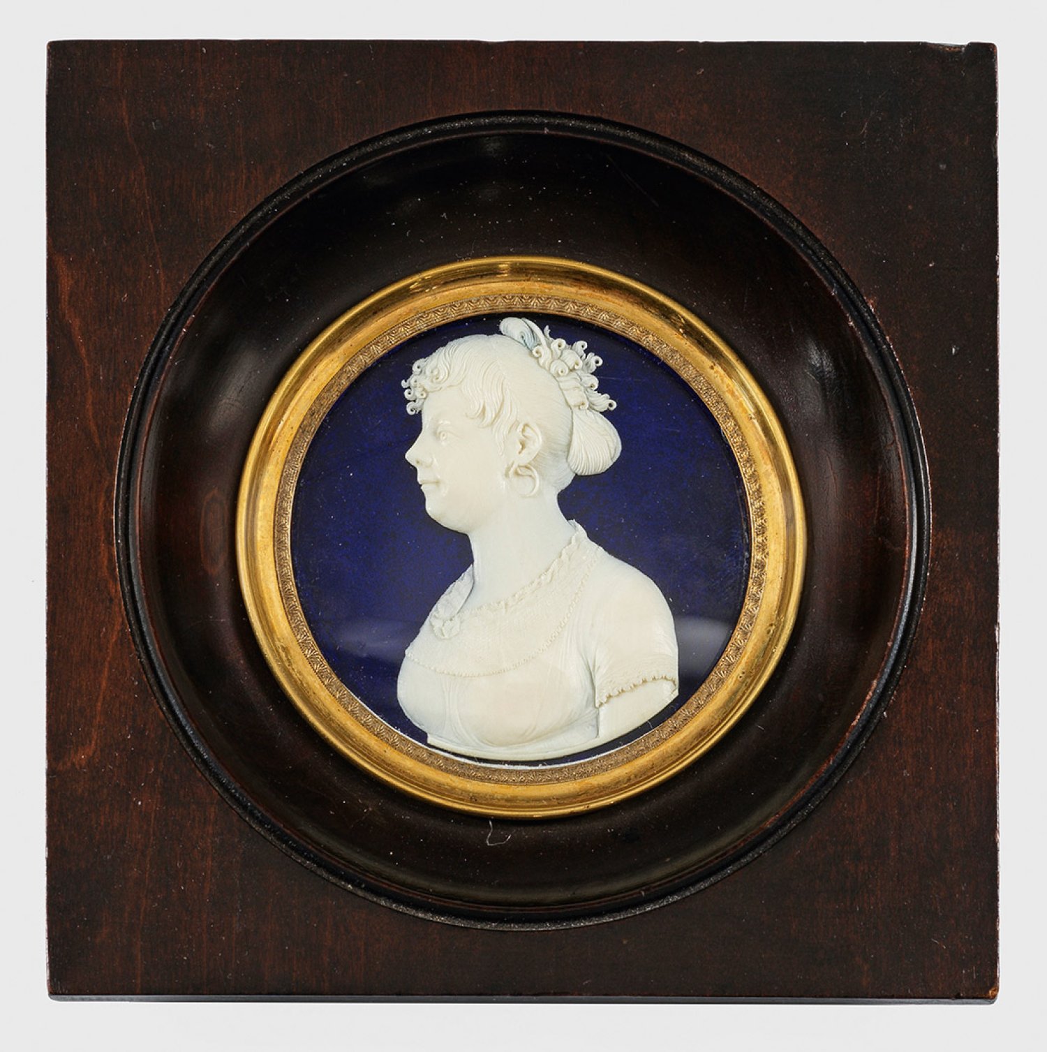 Elfenbein, geschnitzt. Vor blauem Grund fein reliefierte Profilansicht einer jungen Dame mit hochgestecktem Haar. Montiert in dunkelbraunem Holzrahmen mit Messingreif. 12,5 cm x 12,5 cm.