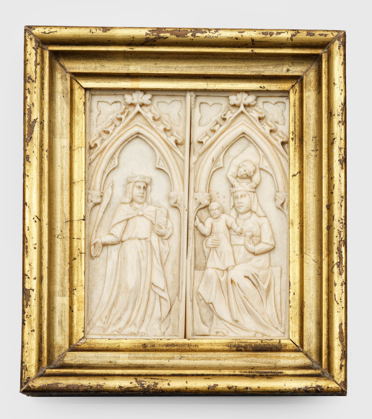 Elfenbein, geschnitzt. Zwei hochrechteckige Relieftafeln als Gegenstücke zusammengefügt. Unter dreipassigen, mit Krabben verzierten, gotischen Spitzbögen die Darstellung der sitzenden Maria mit dem Jesuskind. Oberhalb eine sich hinabneigende Figur, ihr eine Krone aufsetzend. Daneben die Darstellung einer bekrönten Märtyrerin mit Märtyrerpalme. 11,8 cm x 9,4 cm. Rahmen.