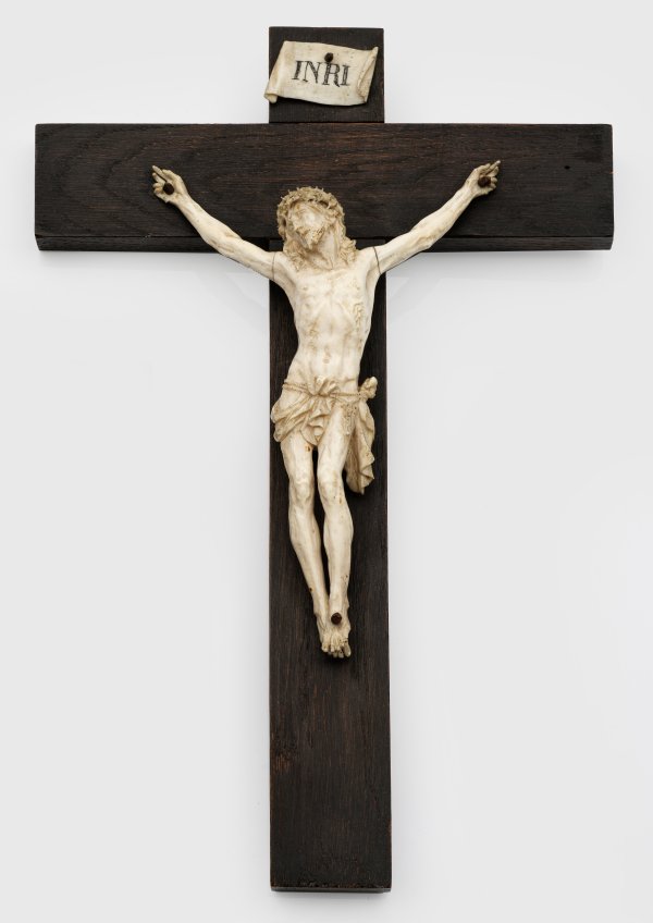Holz und Elfenbein, vollplastisch gearbeitet. Sehr fein geschnitzte Darstellung des Gekreuzigten im Viernageltypus mit hochgestreckten Armen. Das Lendentuch mittig und an der Seite geschlungen. Das bärtige Haupt mit schmerzerfülltem Ausdruck zur rechten Schulter geneigt, auf dem langen, gewellten Haar die Dornenkrone. Oberhalb mit Schriftrolle "INRI". 27 cm x 18 cm. Korpus-H. 16 cm.