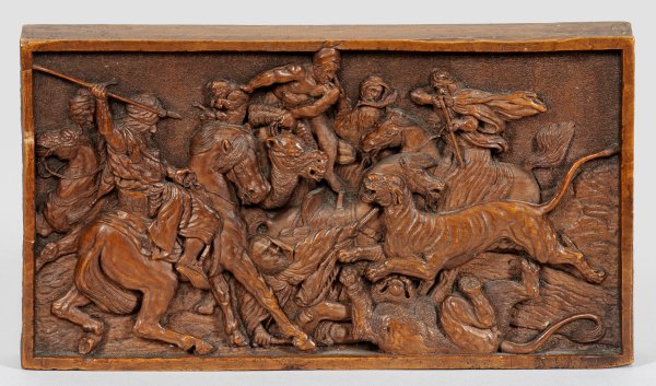Rechteckig. In fein geschnitztem, vertieftem Relief ausgeführte, zur Steigerung der Dramatik stark komprimierte, kompakte Darstellung einer orientalischen Löwenjagd. Dicht gedrängt wird eine arabische Reitergruppe auf Pferden bzw. einem Kamel gezeigt, die schon ein Löwenjunges entrissen haben, während im Vordergrund der Kampf mit Speer und Gewehr gegen zwei ausgewachsene Löwen geführt wird, von denen einer neben einem gestürzten Reiter am Boden liegt. Abgesetzt umrahmende Kante. 10,5 cm x 19,2 cm x 2,1 cm.
