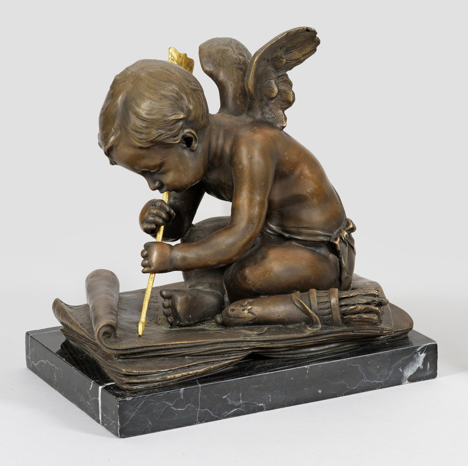 Bronze, dunkelbraun patiniert und teilw. vergoldet. Undeutl. bez.; Schwarzer, hell geädeter Marmorsockel. Vollplastische Darstellung in der Tradition der Belle Epoque. Auf mehreren Pergamentrollen sitzender Armor, auf dem obersten Bogen neben einer Textzeile mit einem goldenen Pfeil zwei miteinander verschlungene Herzen malend, neben ihm ein abgelegter, gefüllter Pfeilköcher. Ges.-H. 27,5 cm.