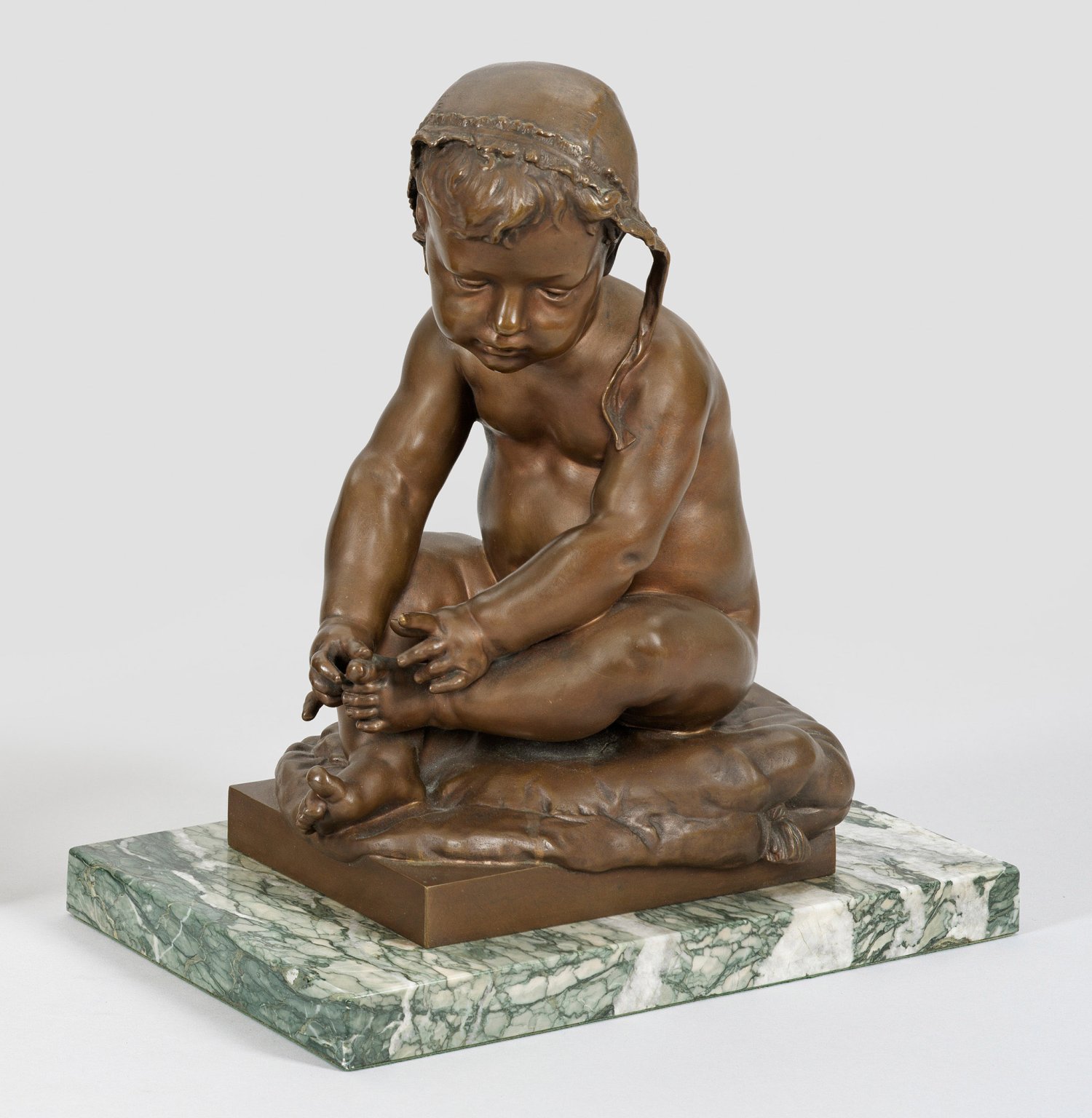 Bronze, dunkelbraun patiniert. Sign.; Guss von Ferdinand Barbedienne, Paris, Ende 19. Jh., bez. "F. BARBEDIENNE Fondeur Paris" und runder Stempel "Réduction Mécanique A. Collas Brevete" (in Versalien). Moderner, grau geäderter Marmorsockel. Vollplastische Darstellung eines auf einem Kissen sitzenden Knaben als pummeliges Kleinkind mit Spitzenhaube, der fröhlich zu plappern scheint, während er mit seinen kleinen Zehen spricht. Plé lernte in den Ateliers der Bildhauer Auguste Préault, Mathurin Moreau und Émile Picault. 1877 debütierte er im Salon des Artistes Français, zwei Jahre später erhielt er seine erste lobende Erwähnung. Anschließend sammelte der vielseitige Bildhauer Auszeichnungen auf den Salons sowie auf den Weltausstellungen in Paris (1889 und 1900). 1884 präsentierte er im Salon die vorliegende sehr originelle Plastik unter dem Titel "Un futur avocat" (Kat-Nr. 3824); beim Originalmodell war auf dem Sockel ein humorvoller, handschriftlicher Erläuterungstext eingeritzt: "Hélas! cela ne suffit pas pour déterminer une vocation d’avocat ou d’orateur". Ges.-H. 30,5 cm.