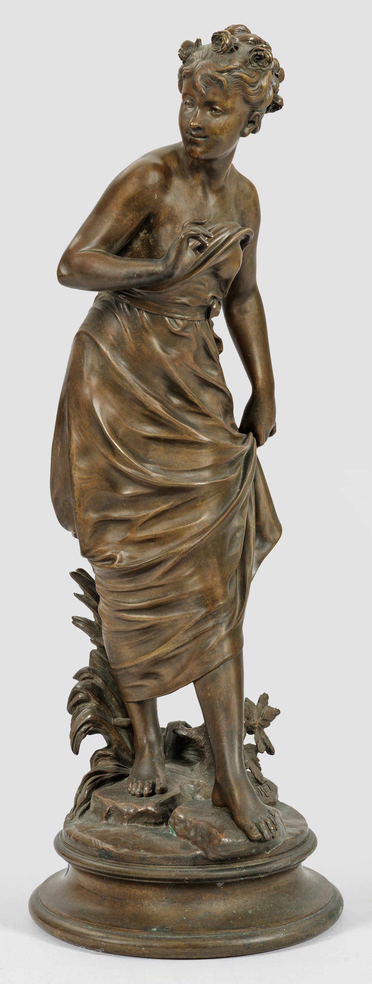 Bronze, dunkelbraun patiniert u. partiell vergoldet. Sign.; Guss des 19. Jhs.; Große, anmutige, vollplastische Statuette der Belle Epoque. Bourets, der bevorzugt Skulpturen mit allegorischen und mythologischen Motiven schuf, stellte 1875-1903 regelmäßig auf dem Pariser Salon aus. H. 58 cm.