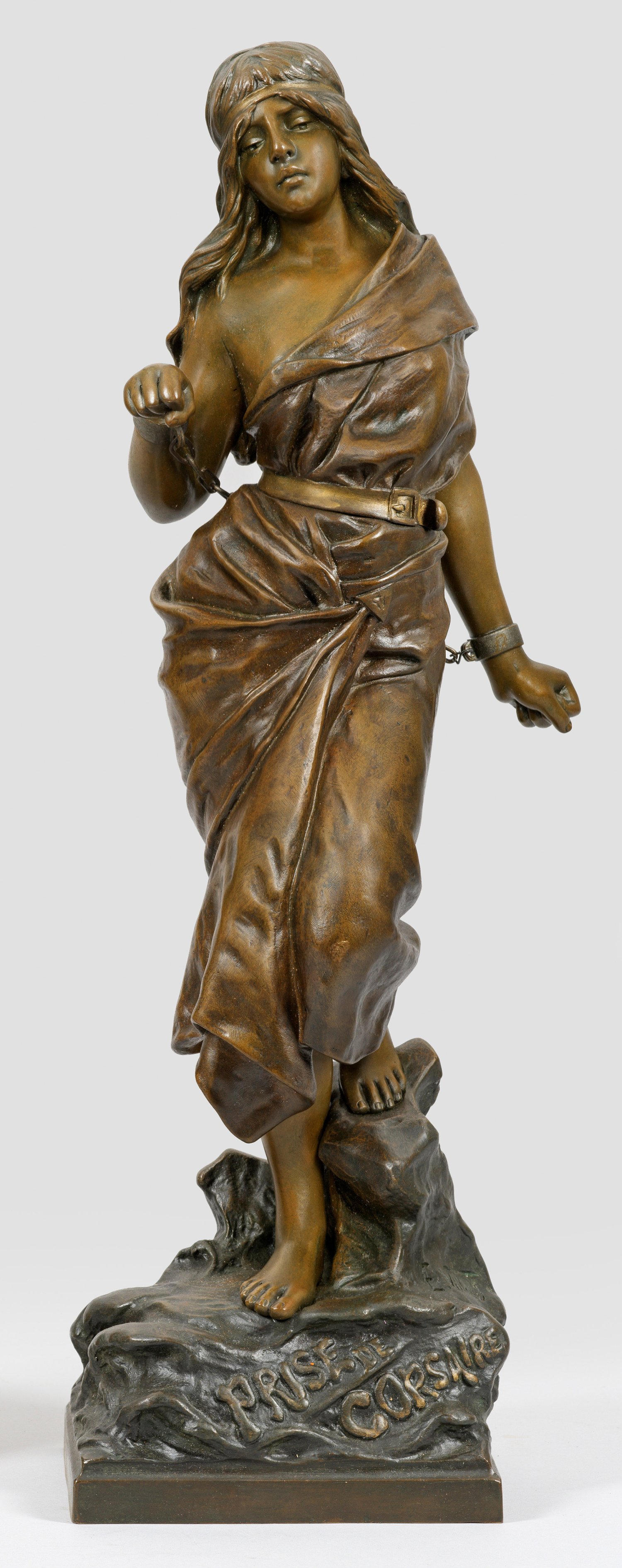 Bronze, in unterschiedlichen Tönen patiniert sowie kaltpatiniert. Sign. u. am Sockel betitelt, Gießermarke der Société de Bronzes de Paris. Vollplastische Darstellung einer von Piraten gefangenen, auf einem Felsen stehenden jungen Frau. Villanis gehört zu den bedeutendsten und schaffenreichsten Bildhauern des französischen Art Nouveau. 1870 ging Villanis nach Turin, wo er 1871-1880 an der Akademie -vornehmlich bei Odoardo Tabacchi (1831 - 1905) studierte. 1881-1885 beschickte Villanis zahlreiche Ausstellungen in Italien, bevor er nach Frankreich zurückkehrte und in Paris ansässig wurde. 1886 stellte er erstmals im Pariser Salon aus. Sein Hauptsujet waren jugendliche Mädchen und junge, schöne Frauen, denen er fast sein ganzes Oeuvre widmete. Seine Büsten und auch seine wenigen ganzfigurigen Statuen erhielten hierbei ihre oft lyrischen Titel als zumeist kunstvoll geschwungene Versalien-Schriftzüge. H. 54,5 cm.