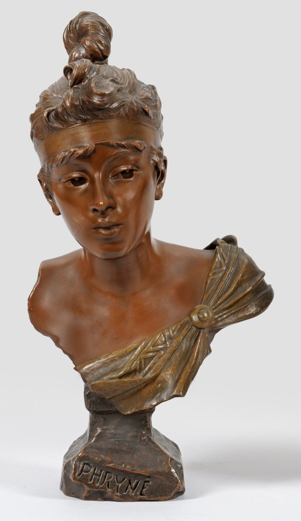 Bronze, in nuancierten Brauntönen patiniert. Sign. u. am Sockel betitelt. Subtil gestalte Darstellung der berühmten, antiken griechischen Hetäre mit Stirnband und hoch geknotetem Haar. Villanis ist einer der bedeutendsten, fleißigsten und erfolgreichsten Bildhauer des französischen Art Nouveau. Er studierte 1871-1880 an der Akademie in Turin und kehrte erst 1885 nach Frankreich zurück. Seit 1886 stellte er auf dem Salon in Paris aus. Villanis schildert fast ausschließlich junge, weibliche Schönheiten als Büsten, seltener auch als Ganzfiguren, die qualitätvollen Bronzegüsse zeichnen sich durch ihre subtilen, differenzierten Patinierungen in zwei und mehr Tönen aus. Stiltypisch überdies sind die ausgehöhlten Augäpfel und die großen, oft lyrischen Titel, die sich als zumeist kunstvoll geschwungene Versalien-Schriftzüge am Sockel befinden. H. 42 cm.